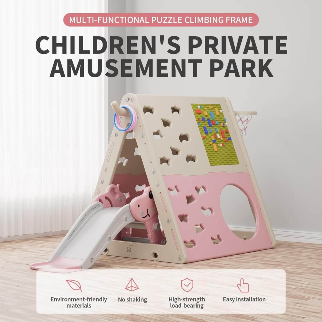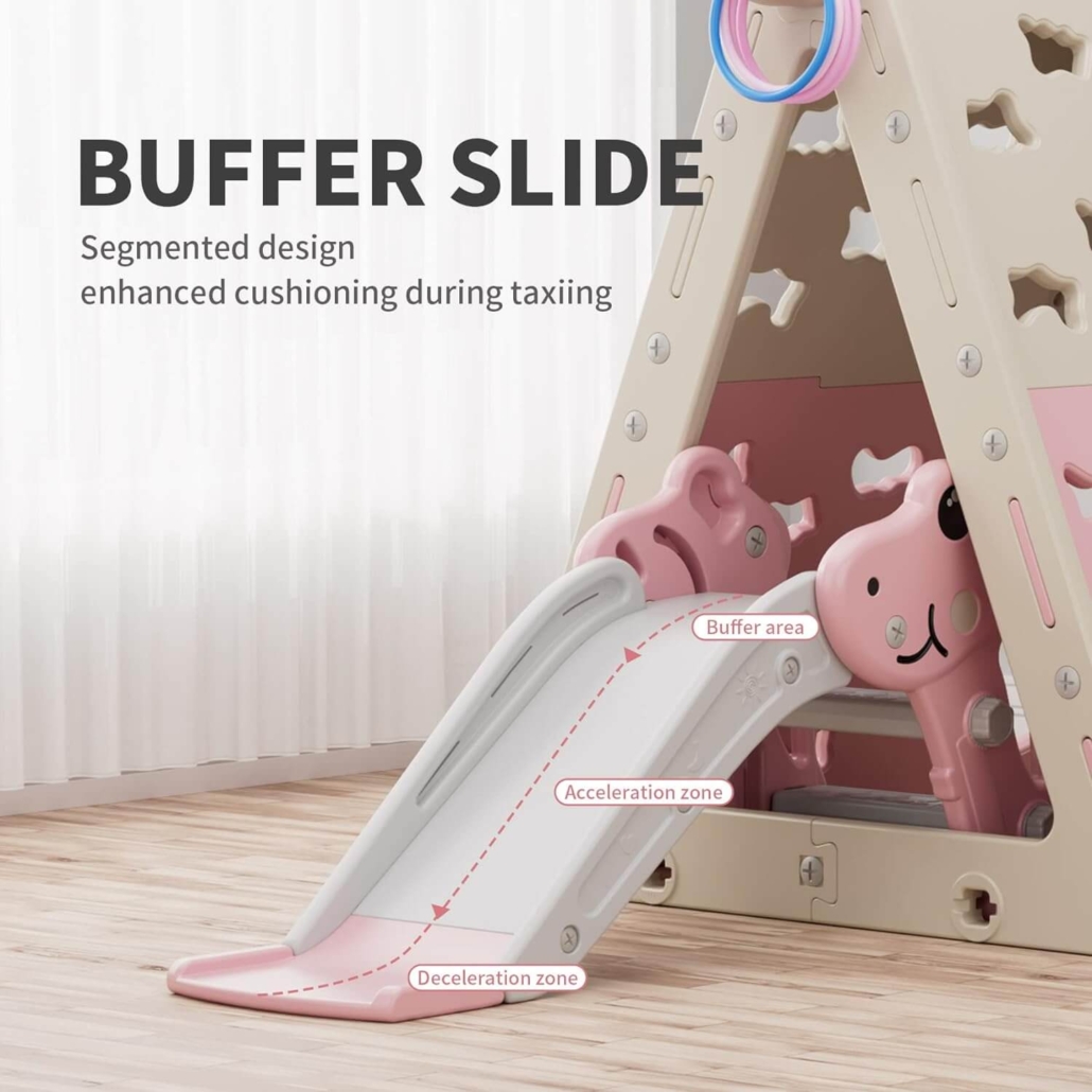 - Friendly Slide and Foldable Storage: The set includes a charming and safe buffer slide with segmented design. The climbing set’s split-folding feature allows easy storage, providing more room for other activities.
