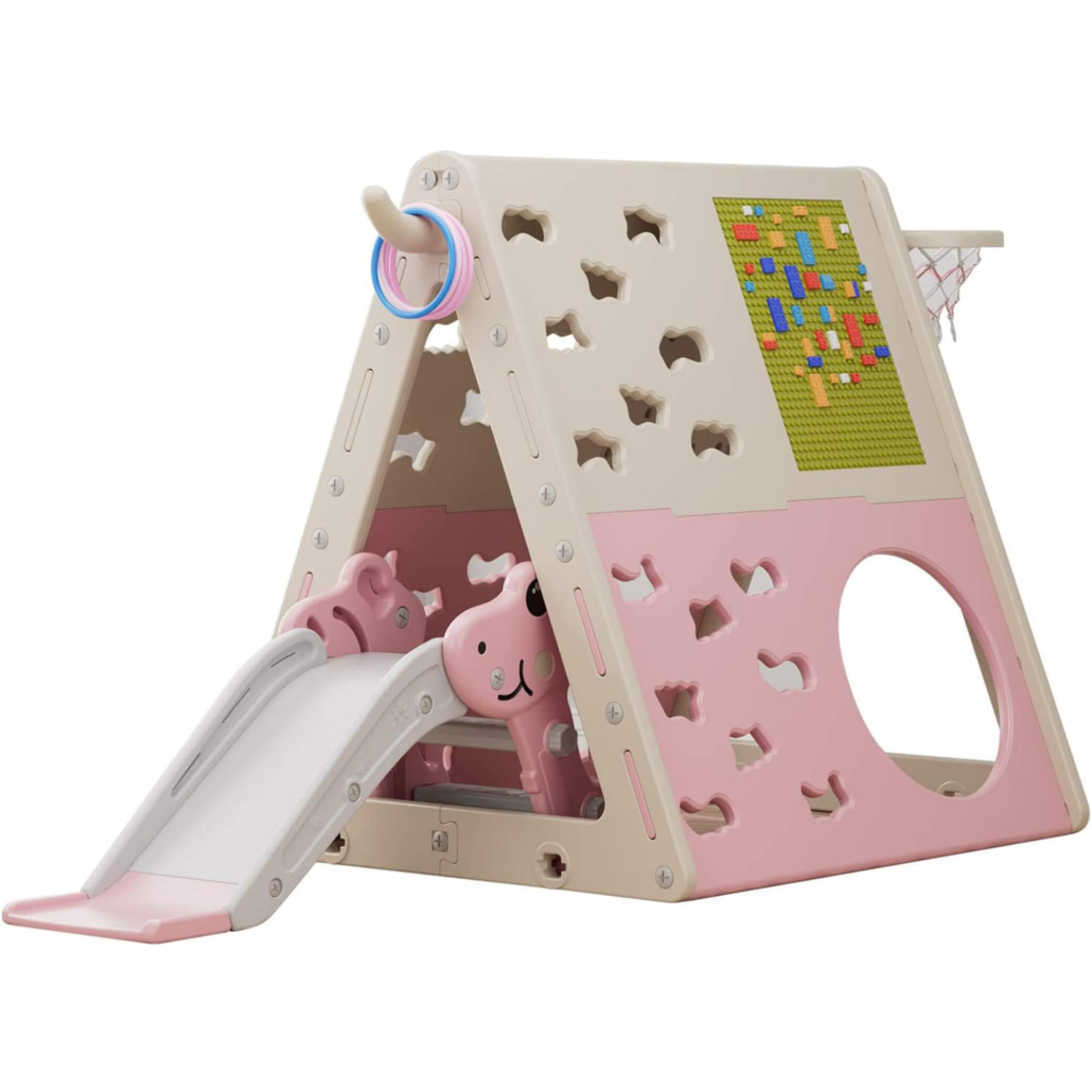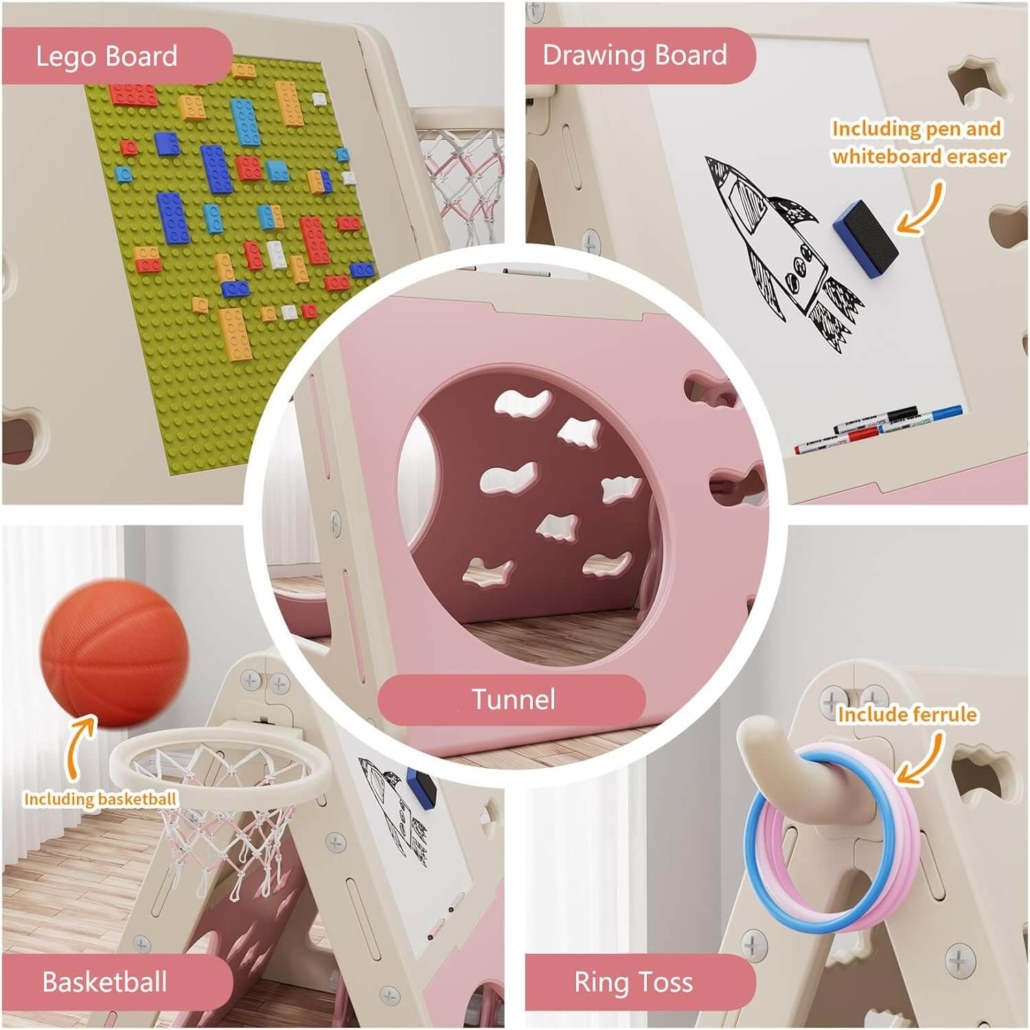 - Multifunctional and Innovative Design: This 7-in-1 pyramid climber set is a child’s playground dream come true! It offers exciting options of climbing, sliding, crawling, painting, ring toss, Lego building, and even basketball play. A great way to provide endless fun and development of key skills in one compact design.